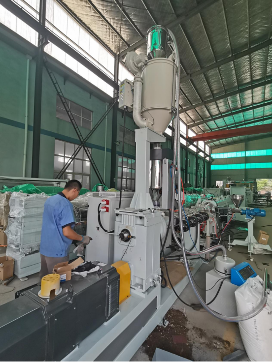 1.原料混合是將PVC穩定劑、增塑劑、抗氧化劑等其它輔料按比例、PVC擠出機工藝先后加入高速混合機內經物料與機械自摩擦使物料升溫至設定工藝溫度然后經冷混機將物料降至40-50度這樣就可以加入到擠出機的料斗。